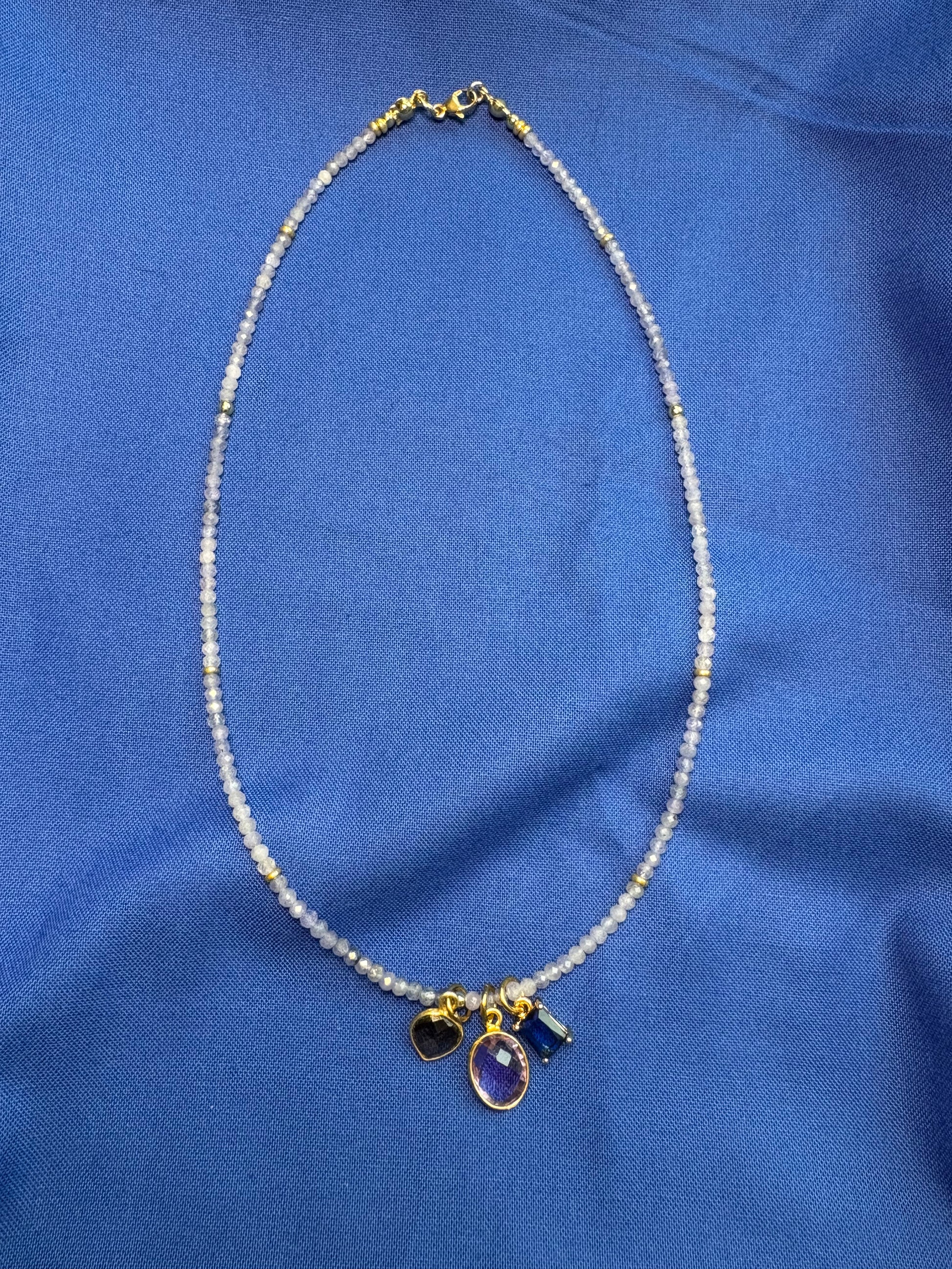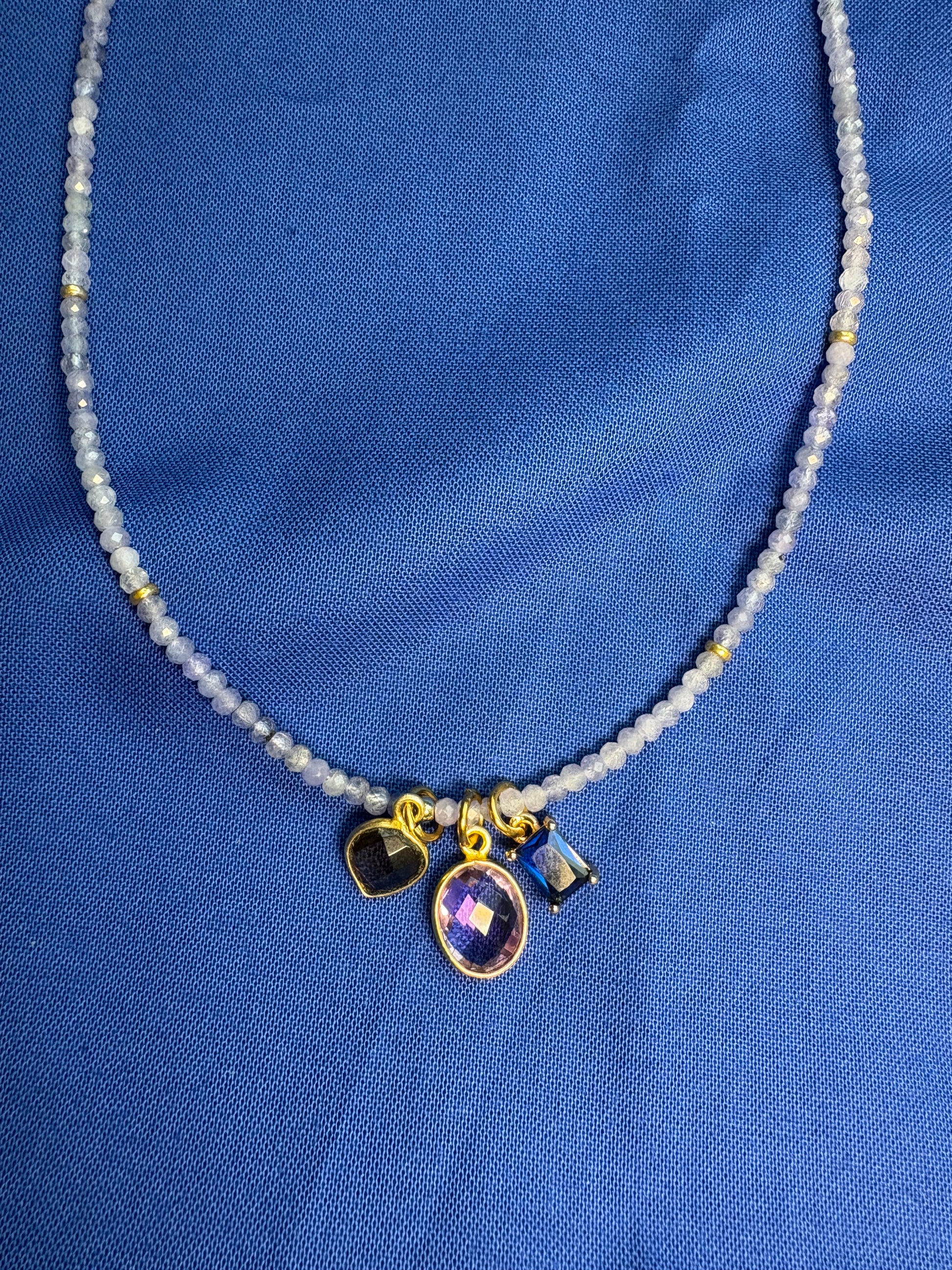 A dreamy tanzanite gemstone necklace accented with three luxe charms: smoky quartz, amethyst, and a royal blue gold-plated glass charm. Finished with a 14k gold-filled clasp at 16.5 inches.